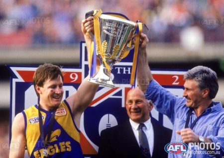 West Coast broke through for a historic first premiership, coming from a half-time deficit to run over the top of Geelong. Peter Matera was a deserving Norm Smith Medal winner with one of the great Grand Final performances, kicking five goals from a wing. Other Eagles to stand up on the big stage included Brett Heady (28 possessions), spearhead Peter Sumich (six goals) and the nuggety Tony Evans (20 possessions and three goals).