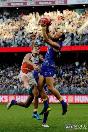 It was short lived, with a contentious holding the ball free kick against Cole deep in defence leading to Himmelberg's second goal. Cripps went with the outside of the right but missed everything. The Giants' kick-in was marked by Naitanui in a repeat of his MOTY effort. His kick forward was rushed through for a behind to tie the scores. Ah Chee was infringed in a marking contest but his shot went virtually over the goal post for a behind, and the narrowest of leads. Rioli outbodied the bigger Corr and converted from right on 50. Lycett received a free and McGovern took the advantage, kicking his second and giving the Eagles a 13-point buffer. A wayward shot by Whitfield reduced that by one. Tim Taranto outmarked Masten but his shot also went wide as time expired, leaving the Eagles ahead by 11 points.